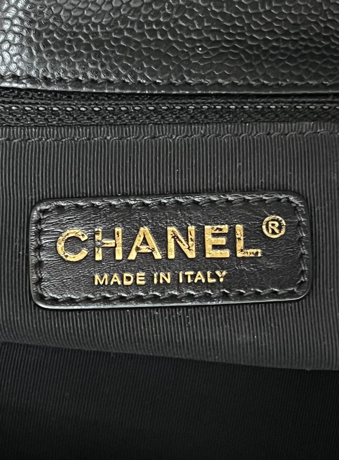 This stylish tote is crafted of diamond quilted caviar leather in black. This shoulder bag features leather threaded polished gold chain-link shoulder straps with shoulder pads, a quilted Chanel CC logo on the front and a flat pocket on the rear. The top opens to a partitioned black interior with zipper and patch pockets.