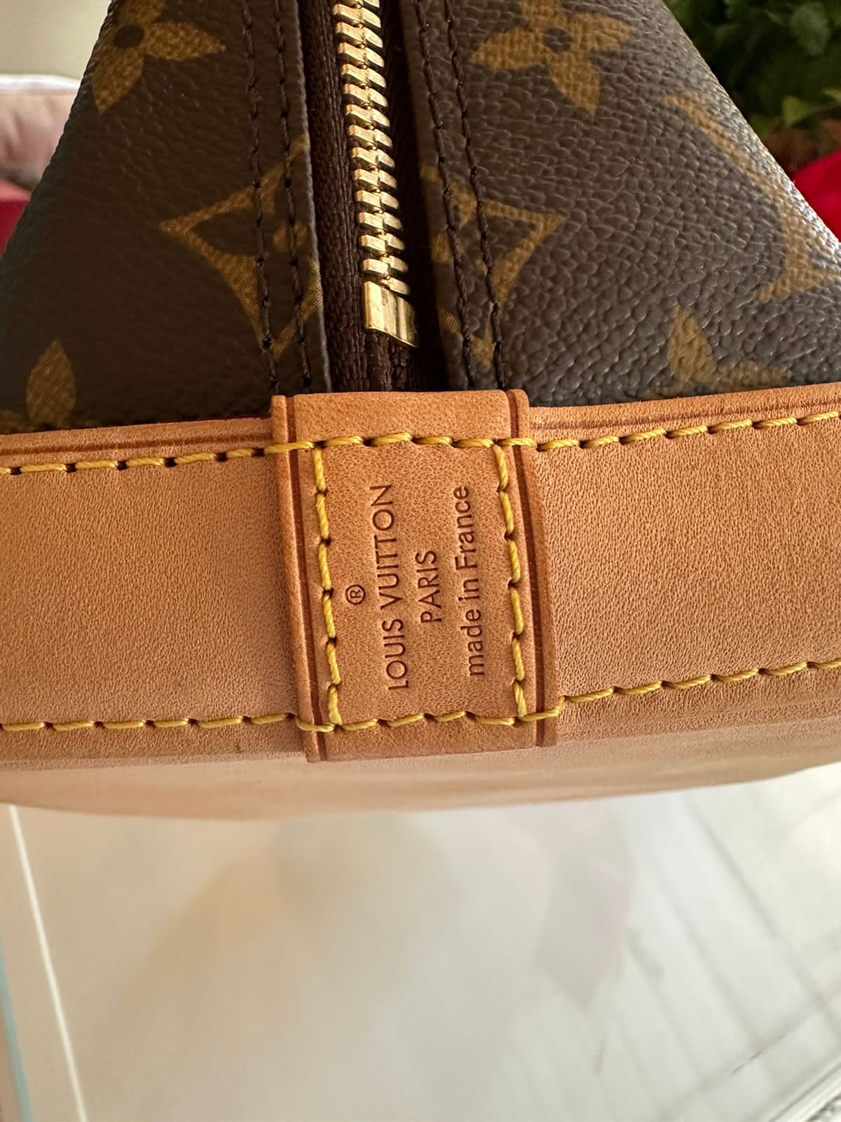 This handbag is crafted of a durable Louis Vuitton monogram toile canvas. The handbag features rolled vachetta leather handles, a vachetta base, and polished brass hardware. The wrap-around zipper opens to a brown fabric interior with a flat pocket.