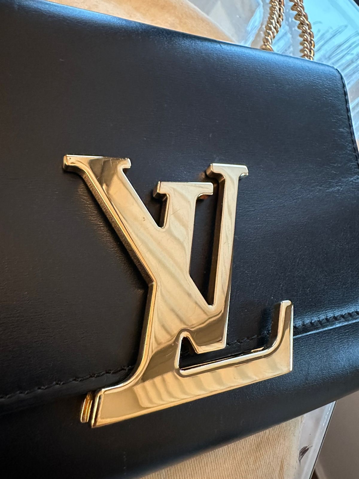 This luxurious bag features an oversize LV logo flip clasp with a golden chain strap. This elegant and modern bag is crafted out of Black Box calf leather and opens to reveal a spacious interior complete with card slots and a zip pocket, making this the perfect companion for day or night. Current retail price is $2810.