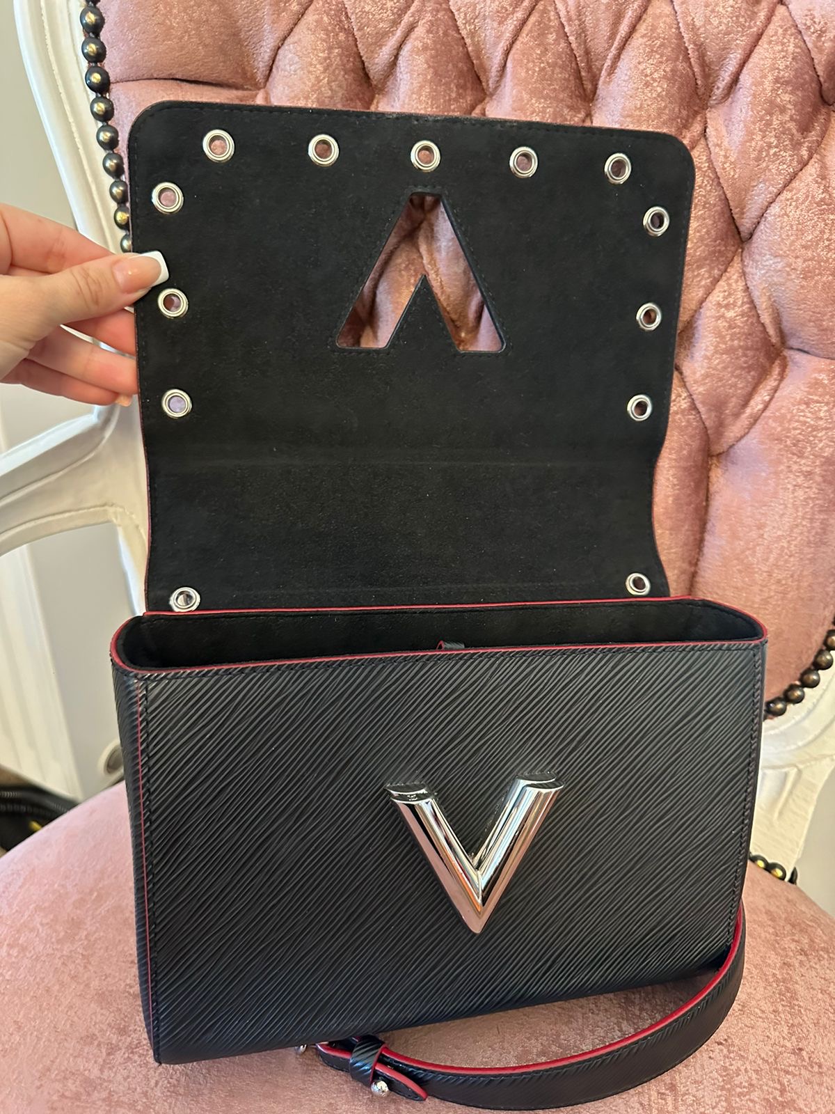 Louis Vuitton Twist model bag with silver metal studs and red edging (limited edition). Medium model (see dimensions), worn across the body, with dustbag and mirror. Bag in excellent condition.This wonderful bag can go from day to night. Carry it on your shoulder or crossbody.