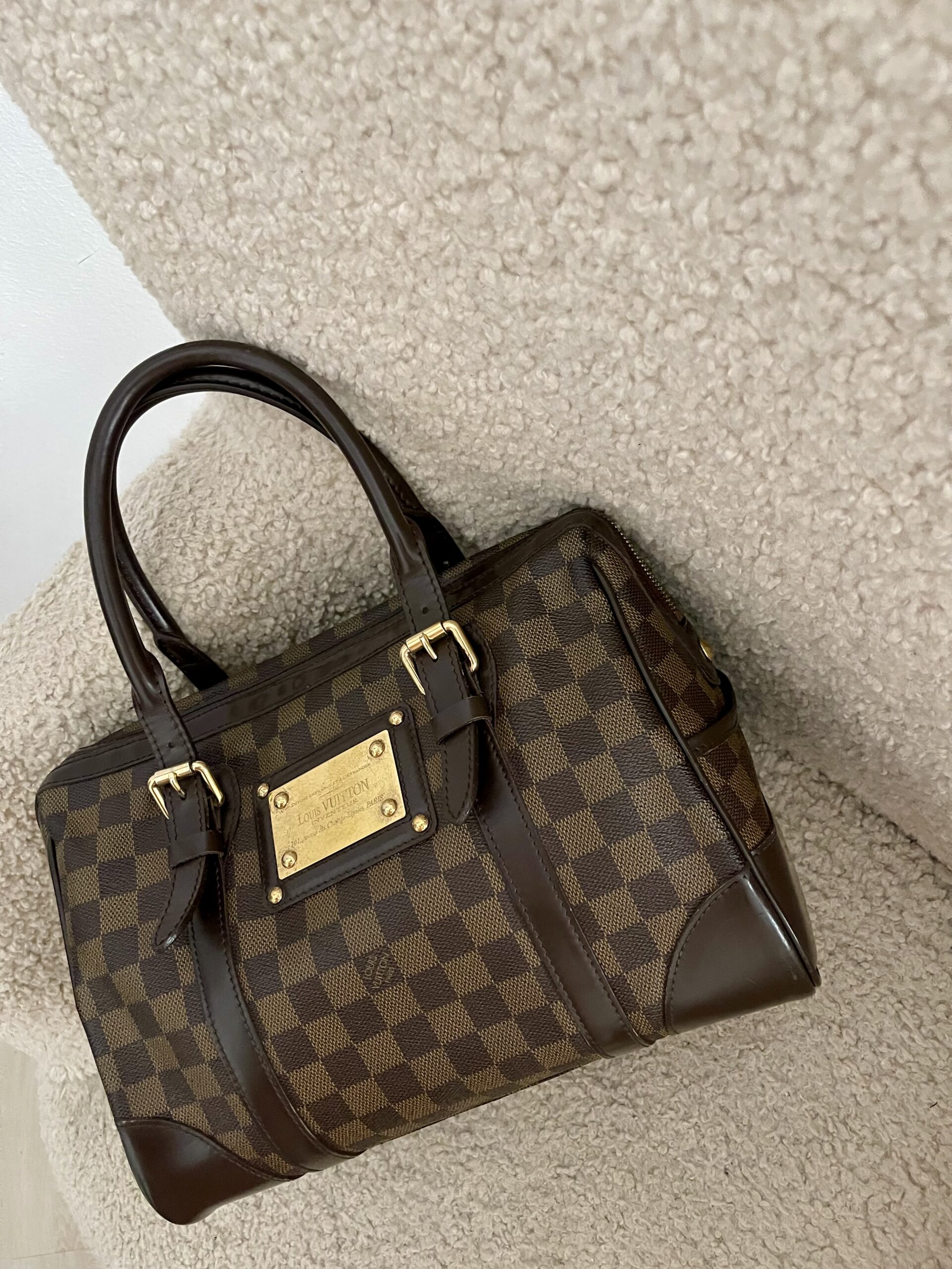 This Louis Vuitton Berkeley bag flaunts the designer’s rich heritage. Elegantly structured from Damier Ebene canvas, this LV creation is styled with leather trims and dual handles. The top zip closure opens to an Alcantara lined interior housing a slip pocket. The LV engraved metal plate adds to the subtle branding of the bag.