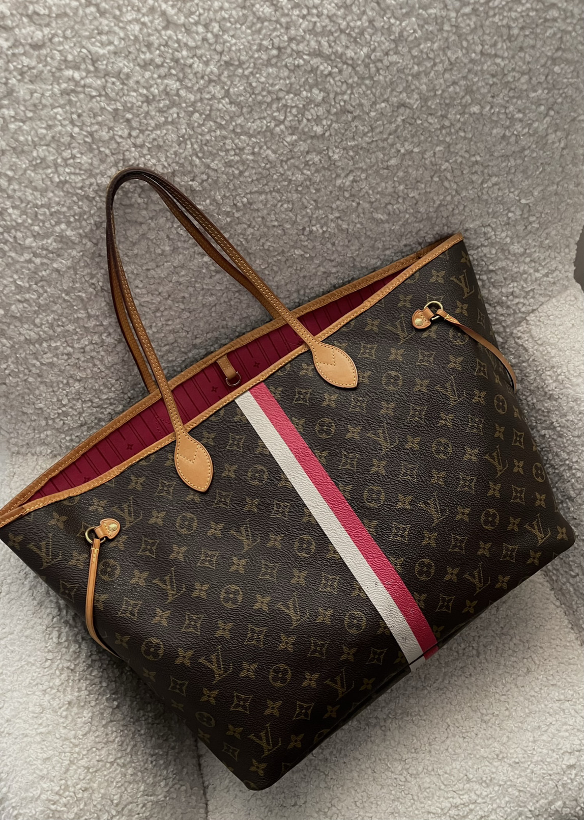 This is an authentic LOUIS VUITTON Monogram My LV Heritage Neverfull GM. This stylish tote is crafted of classic Louis Vuitton monogram coated canvas and is in the largest size. A stripe is custom printed around the face and rear. The tote features thin vachetta cowhide leather top strap handles, trim and side cinch cords with polished brass hardware. The wide top is open to a striking red canvas interior with zipper pocket. This is a marvelous tote that is ideal for day with the luxury and style, from Louis Vuitton!