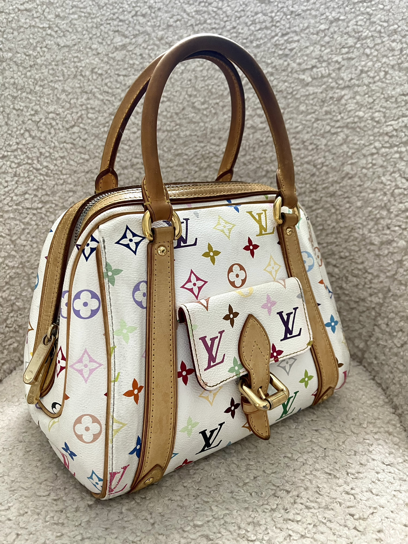 This is an authentic Louis Vuitton Multicolor Priscilla in White. This timeless tote is crafted of Louis Vuitton multicolor monogram in 33 vibrant colors on white canvas. The bag features vachetta cowhide leather trim including rolled leather top handles and straps around the exterior mid-line. This bag also features brass hardware including handle links, studs and a buckle for the front belt that closes the frontal external flap pocket. The top wrap-around zipper opens to a raspberry red microfiber interior with pockets.