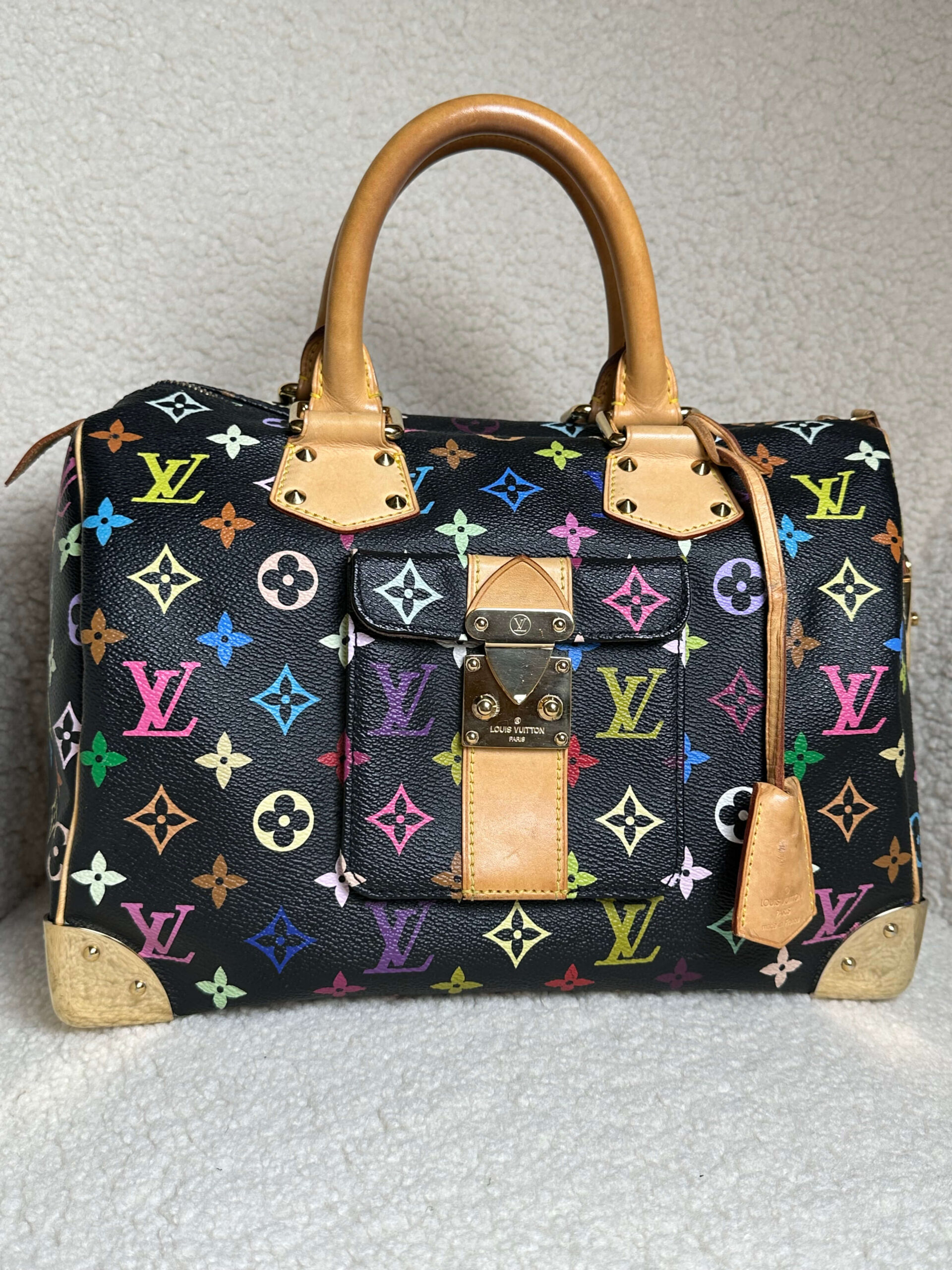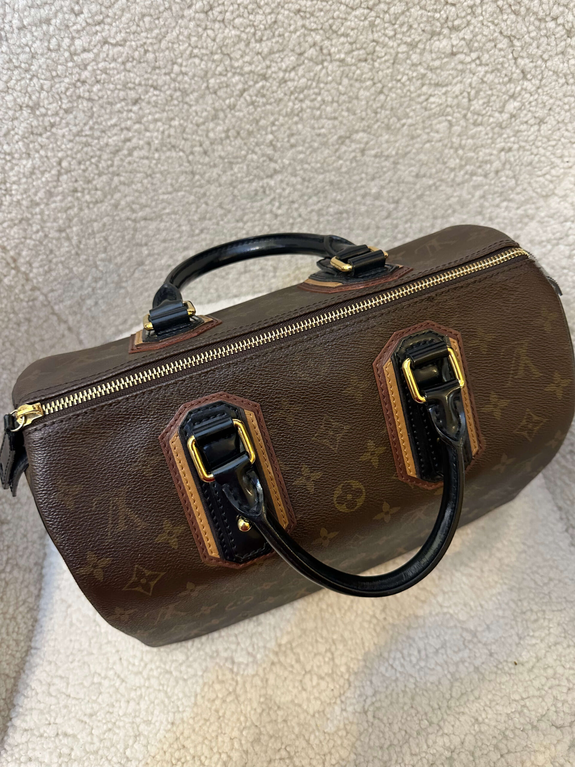 This elegant Speedy bag has all of the features of the standard Speedy but here in the theme of noir or black. The effect is quite different and striking! The bag has the monogram toile canvas but done with brown on an ombre brown to black background. The handles are a finished cowhide leather in patent black. The interior is alcantara lined in black with a flat pocket. The hardware accents are beautiful polished brass. This is a stunning and beautiful limited edition from Louis Vuitton.Original retail price is $1870.