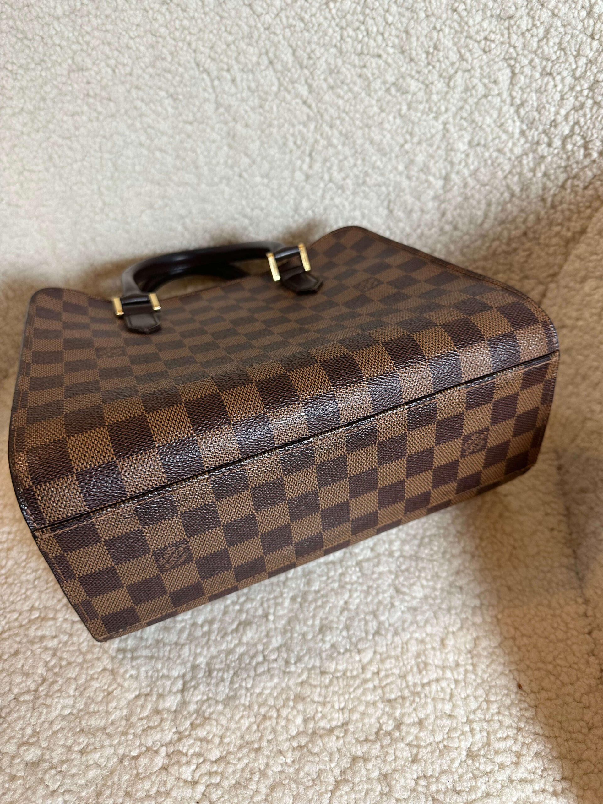 This structured Triana bag from Louis Vuitton is made from classic Damier Ebene canvas and features dual round handles. The zip closure opens to an Alcantara lined interior that houses a slip pocket and a phone pocket. Keep your essentials close at hand with this bag.