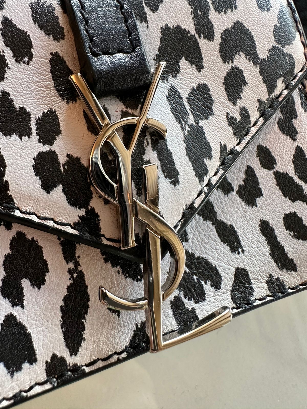 This petite crossbody bag is crafted of black and white Dalmatian printed calfskin leather. The bag features a polished silver chain link shoulder strap, and a facing envelope-style flap with a prominent silver YSL logo. The flap opens to a black leather interior. This stunning crossbody bag is suitable for holding cards or other small essentials, with the classic chic of Saint Laurent!