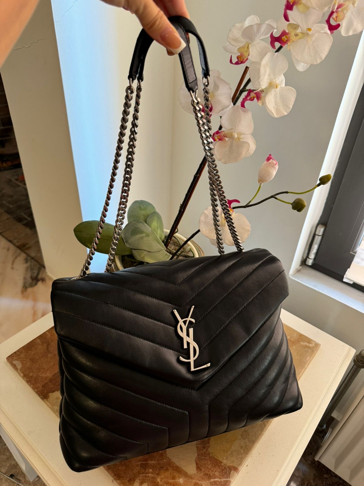 This stylish Yves Saint Laurent Quilted Leather Medium LouLou Bag is the perfect city bag and is great for carrying all your daily essentials. The bag is crafted out of durable shiny calfskin leather in the brand’s signature ‘Y’ quilted pattern. It has a large envelope flap style closure with a polished YSL logo. The bag has a sliding chain strap with leather shoulder pad. You will love this fabulous everyday bag!